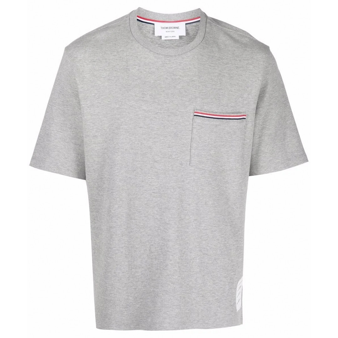 Thom Browne Oversized Short Sleeve Pocket Tee - 100% Cotton - Light Grey - Round neck - Short sleeves - Chest patch pocket - RWB stripe detail - Name tag applique - Signature grosgrain loop tab - Side vents - Straight hem - Hem hits at hips - Oversized fit