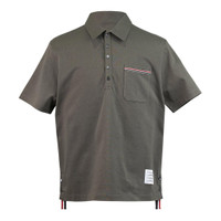 600068917GRN000 / AW25-MJP230E-J0235/00/310 - Five-button placket with mother-of-pearl buttons - Chest pocket with tricolor ribbon trim - Signature grosgrain side tabs at hem - Oversized relaxed fit - Premium cotton pique construction - Classic spread collar - Thom Browne label at bottom hem The Thom Browne Oversized Short Sleeve Polo delivers refined American luxury with contemporary relaxed tailoring. Crafted from premium cotton pique in sophisticated olive green, featuring the brand's signature grosgrain side tabs and tricolor ribbon detailing. The oversized silhouette and classic polo construction create a modern essential for elevated casual wear.