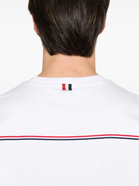 600068728WHT000 / PF25-MJS288A-00042/00/100 - Oversized relaxed fit - Short sleeves - Signature tricolor grosgrain ribbon trim - Premium cotton construction - Crew neckline - Ribbed collar and cuffs The Thom Browne Oversized Short Sleeve Tee delivers contemporary comfort with signature tailored refinement. Crafted from premium cotton in crisp white, featuring the brand's distinctive grosgrain ribbon trim detailing. The relaxed oversized fit and subtle brand elements create a sophisticated casual staple.