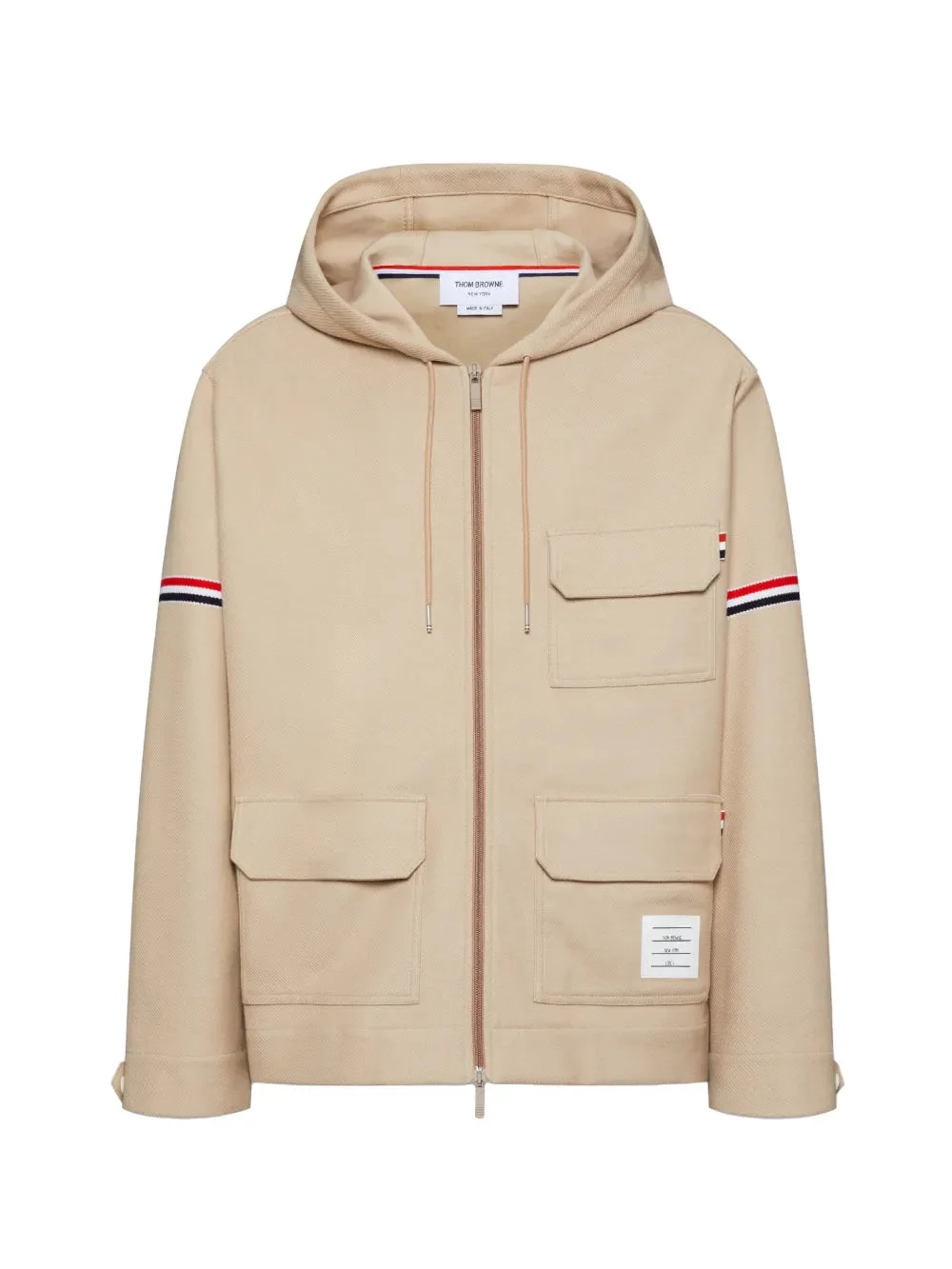 600077526BGE001 / PS26-MJT567A-J0250/00/260 - Full zip front closure with hood - Signature tricolor stripe sleeve details - Multiple utility pockets - Adjustable drawstring hood - Cotton twill construction - Oversized relaxed fit - Thom Browne label patch Thom Browne Oversized Zip Up Parka delivers contemporary luxury outerwear with signature preppy-meets-modern design. Crafted from premium cotton twill in refined beige, featuring the brand's iconic tricolor stripe detailing on the sleeves. The oversized silhouette and functional multi-pocket construction create versatile layering for sophisticated casual wear.