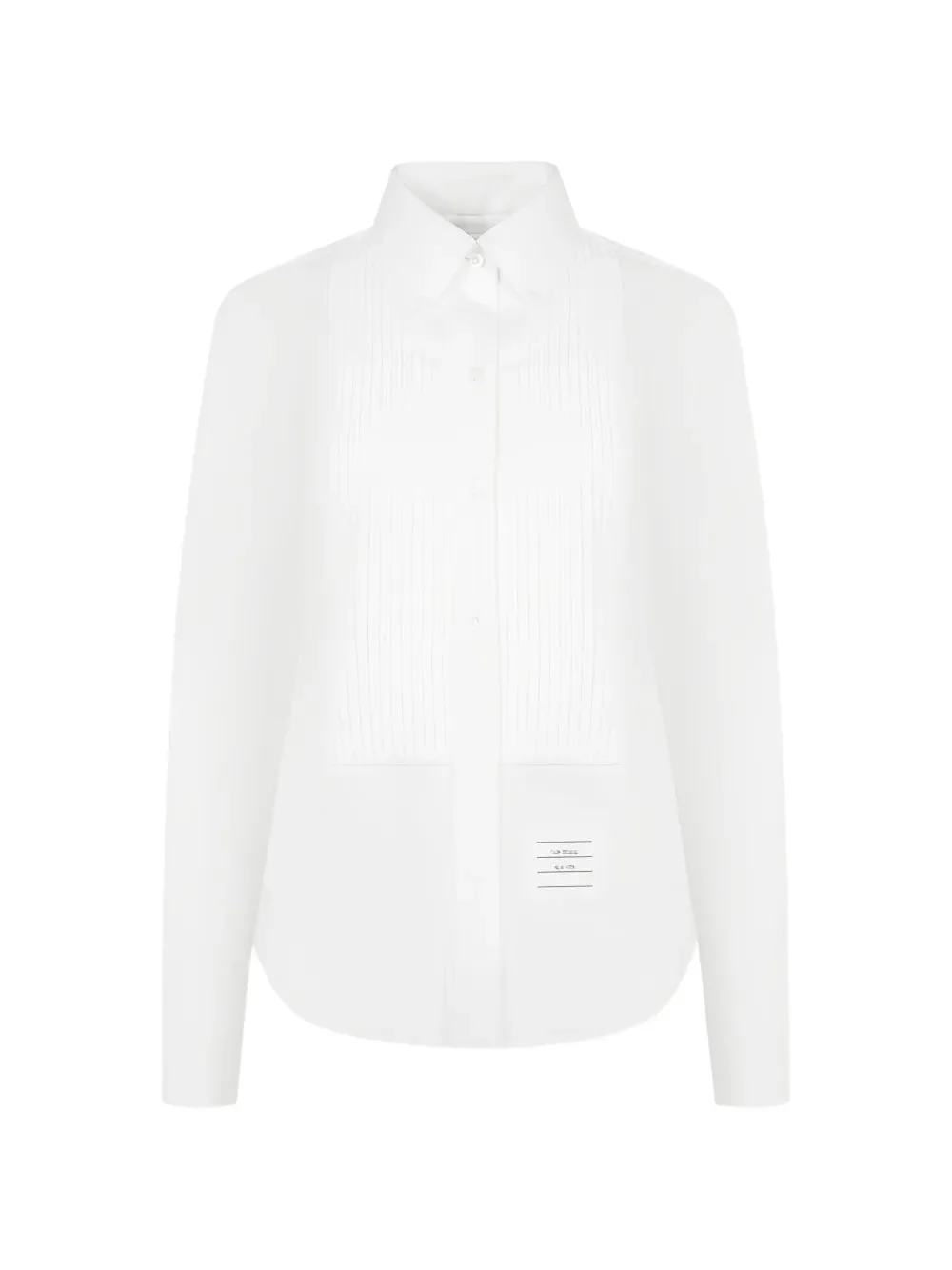 600077719WHT038 / PS26-FLL213A-F1004/00/100 - Pleated bib front panel - Classic point collar - Long sleeves with barrel cuffs - Button-through front closure - Cotton poplin construction - Tailored fit The Thom Browne Plisse Bib Button Down delivers sophisticated tailoring with signature architectural detailing. Crafted from crisp cotton poplin in clean white, featuring a pleated bib front and structured point collar construction. The precise pleating and refined proportions showcase Thom Browne's mastery of traditional menswear codes reimagined for contemporary wardrobes.