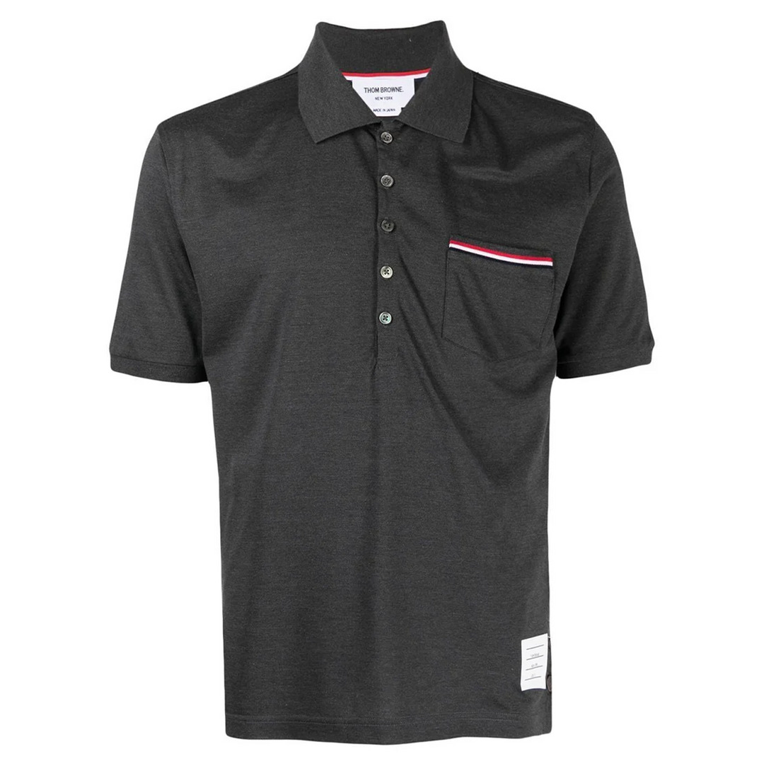 Thom Browne Pocket Polo In Fine Mercerized The Pocket Polo In Fine Mercerized from Thom Browne offers a modern take on the classic polo design with a patch pocket on the chest featuring the brand's iconic RWB stripe. This piece's versatility allows it to seamlessly transition between casual and formal occasions, making it a valuable addition to any wardrobe. - 100% Cotton - Charcoal - Polo collar - Short sleeves - Stripe detailing - Front button placket - Logo patch at the hem - Straight hem - Hem hits at hip