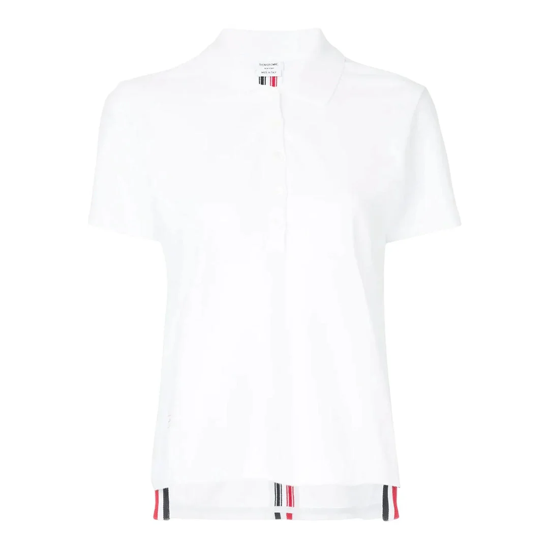 600042411WHT040 / FJP014A-00050/00/100 - Classic polo collar with button placket - Signature tricolour stripe detailing - Short sleeves with ribbed cuffs - Relaxed fit silhouette - Premium pique cotton construction - Ribbed hem with stripe accent The Thom Browne Relaxed Fit Short Sleeve Polo delivers contemporary luxury with signature preppy sophistication. Crafted from premium pique cotton in crisp white, featuring the brand's iconic tricolour stripe detailing at the collar, cuffs, and hem. The relaxed silhouette and distinctive Thom Browne aesthetic create a refined casual staple for the modern wardrobe.