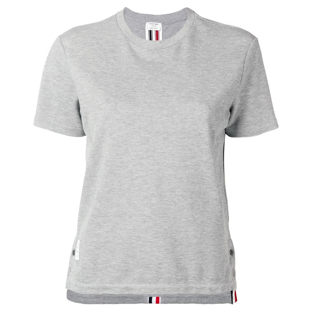 Thom Browne Relaxed Fit Short Sleeve Tee Crafted with meticulous attention to detail, this British masterpiece features a relaxed silhouette, exuding effortless elegance. The soft, breathable fabric and iconic tricolor stripe print on the rear add a touch of sophistication to any casual ensemble. - Light Grey  - Round collar  - Short sleeves  - Relaxed fit  - Signature tricolor stripe print on the rear
