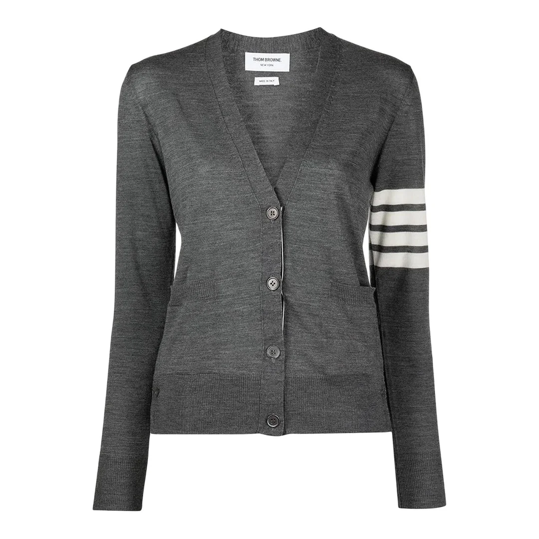 600001790GRY036 / FKC334A-Y1014/00/035 - Button-front closure with four matching buttons - Signature four-bar stripe detail on left sleeve - V-neckline with ribbed trim - Front patch pockets - Ribbed cuffs and hem - Premium merino wool construction - Relaxed fit through body The Thom Browne Relaxed Fit V Neck Cardigan delivers sophisticated preppy luxury with signature architectural tailoring. Crafted from premium merino wool in classic medium gray, featuring the brand's iconic four-bar stripe detail on the left sleeve. The relaxed silhouette and button-front closure create a timeless piece that elevates both casual and refined looks.