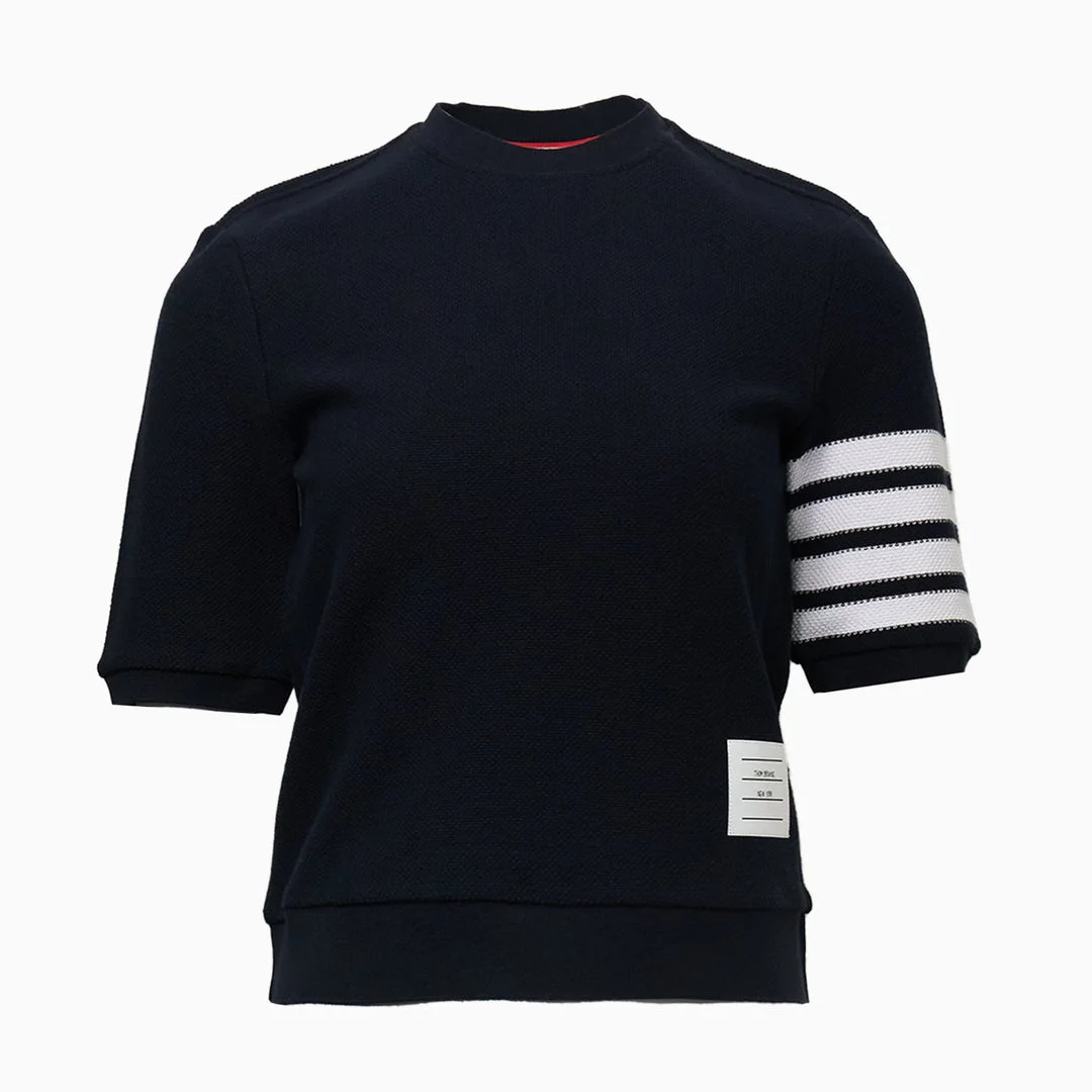 600077661NVY038 / PS26-FJS222A-J0248/00/415 - Textured cotton pique construction - Signature four-bar stripe sleeve detail - Ribbed crew neckline and cuffs - Short sleeves with contrast trim - Brand label at hem - Regular fit Thom Browne Rib Cuff Tee delivers sophisticated casual wear with premium textured pique construction and architectural tailoring. Crafted from high-quality cotton pique in navy, featuring signature striped sleeve detailing and ribbed cuffs for structured comfort. The brand's iconic four-bar stripe accent and clean minimalist silhouette create a refined wardrobe essential.