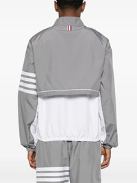 600060091GRY000 / SS25-MJT512A-08031/00/035 - Full zip closure with stand collar - Signature four-bar stripe on sleeve - Color-blocked panel construction - Lightweight ripstop nylon fabrication - Elasticated cuffs and hem - Regular athletic fit The Thom Browne Ripstop 4-Bar Color Block Windbreaker delivers lightweight protection with the designer's signature preppy athleticism. Crafted from durable ripstop nylon in sophisticated gray and white colorblocking, featuring the iconic four-bar stripe detailing. The structured silhouette and premium construction elevate athletic-inspired outerwear with Thom Browne's distinctive tailored aesthetic.