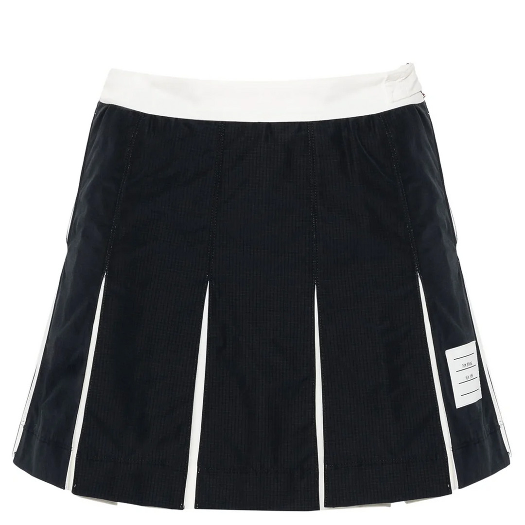 600060045NVY038 / PS25-FJK133A-07651/00/415 - Ripstop fabric construction - Elasticated waistband with drawstring - Box pleat detailing throughout - Contrast white waistband - Side seam pockets - Mini length silhouette - Relaxed fit The Thom Browne Ripstop Box Pleat Mini Skirt delivers preppy sophistication with modern athletic construction and signature tailoring. Crafted from durable ripstop fabric in classic navy with crisp white waistband, featuring precise box pleats that create structured movement and shape. The sporty-luxe aesthetic combines Thom Browne's academic heritage with contemporary performance materials for versatile styling.