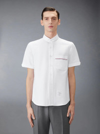 600068932WHT001 / AW25-MWS328E-E1403/00/100 - Classic point collar - Short sleeves - Button-front closure - Signature RWB embroidered detailing - Four-bar stripe accent - Premium cotton construction - Tailored fit - Made in USA The Thom Browne RWB Embroidery Short Sleeve Shirt delivers signature American luxury with meticulous tailoring and craftsmanship. Crafted from premium white cotton poplin featuring the iconic red, white, and blue embroidered detailing that defines the brand's heritage. The clean silhouette and signature four-bar stripe accent create a sophisticated statement piece for discerning wardrobes.