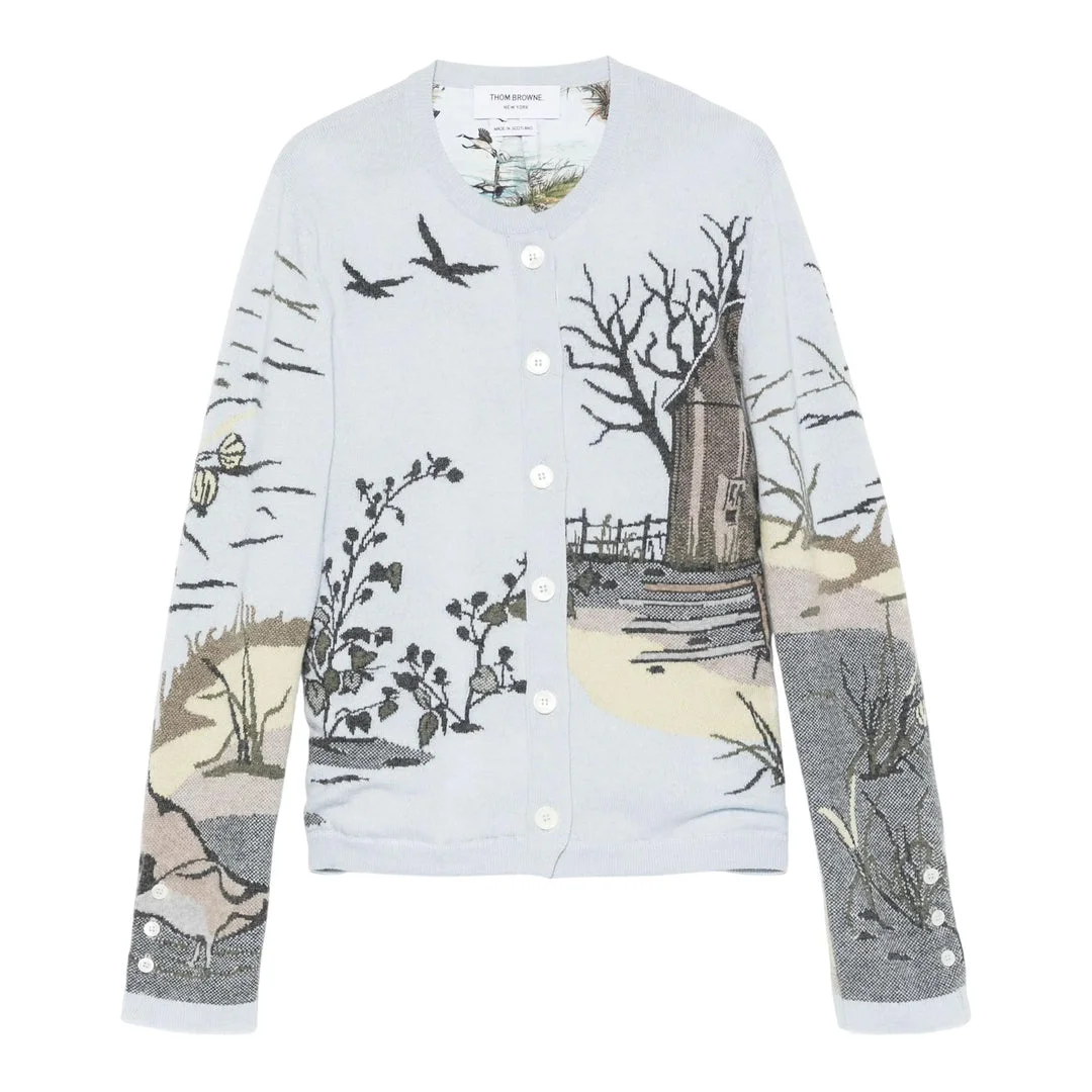 300048583LBL-38 / P5FKC656A-Y2007/00/472 - Button-front closure with white buttons - Long sleeves with ribbed cuffs - Intricate scenic landscape intarsia design - Silk twill and cashmere blend construction - Ribbed hem and neckline - Regular fit - Features birds, trees and pastoral motifs Thom Browne Scenic Intarsia Cashmere Cardigan delivers artistic sophistication with masterfully crafted knitwear construction. Made from premium silk twill and cashmere blend in soft gray, featuring an intricate scenic landscape intarsia throughout depicting birds, trees, and pastoral elements. The sophisticated jacquard technique and signature Thom Browne attention to detail create a wearable piece of art for discerning wardrobes.