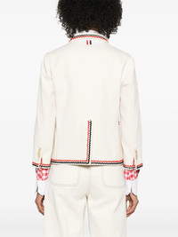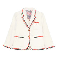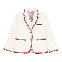 600068805WHT040 / PF25-FBC788B-F0950/00/100 - Two-button front closure with signature gold buttons - Tricolor grosgrain trim along lapels and edges - Chest welt pocket with tricolor detail - Two front flap pockets - Cropped length design - Premium selvedge denim construction - Relaxed sack fit - Striped lining The Thom Browne Selvedge Denim Cropped Sack Sportcoat delivers tailored sophistication with contemporary American craftsmanship. Constructed from premium selvedge denim in crisp white, featuring the signature tricolor grosgrain trim along all edges and pocket details. The cropped sack silhouette and iconic Thom Browne aesthetic create a refined statement piece that bridges formal and casual wardrobes.