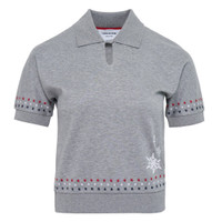 600077658GRY038 / PS26-FJP118E-J0055/00/035 - Keyhole neckline with polo collar - Dolman short sleeves - White snowflake intarsia detail - Red, white and navy star pattern bands - Ribbed collar and cuffs - Premium cotton knit construction - Relaxed fit Thom Browne Short Sleeve Dolman Keyhole Polo delivers contemporary luxury with signature preppy-meets-modern design. Crafted from premium knit cotton in sophisticated gray melange, featuring the brand's iconic snowflake intarsia and Fair Isle-inspired star patterns. The dolman sleeve construction and keyhole neckline create a refined silhouette with distinctive Thom Browne heritage details.