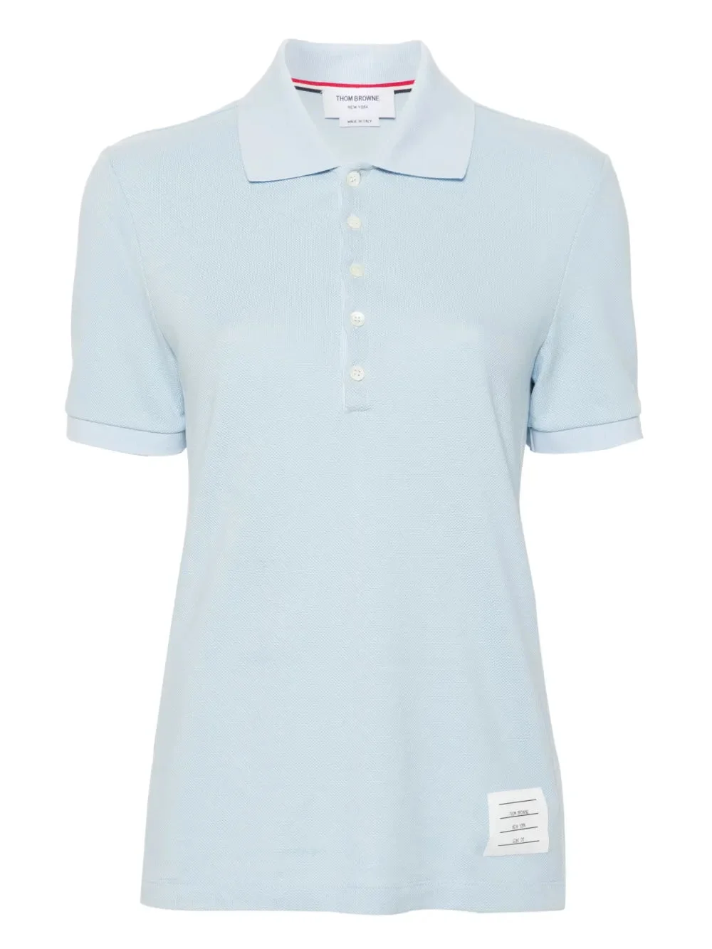 600069027LBL038 / CP-FJP107A-00050/00/480 - Five-button placket with mother-of-pearl buttons - Ribbed short sleeves with rolled cuffs - Classic polo collar with grosgrain taping - Signature four-bar stripe tab at hem - Premium pique cotton construction - Tailored fit The Thom Browne Short Sleeve Rib Cuff Polo delivers sophisticated preppy style with signature tailored construction. Crafted from premium pique cotton in classic light blue, featuring the brand's distinctive ribbed cuffed sleeves and grosgrain collar detail. The refined silhouette and signature Thom Browne four-bar stripe detailing create an elevated take on the classic polo shirt.
