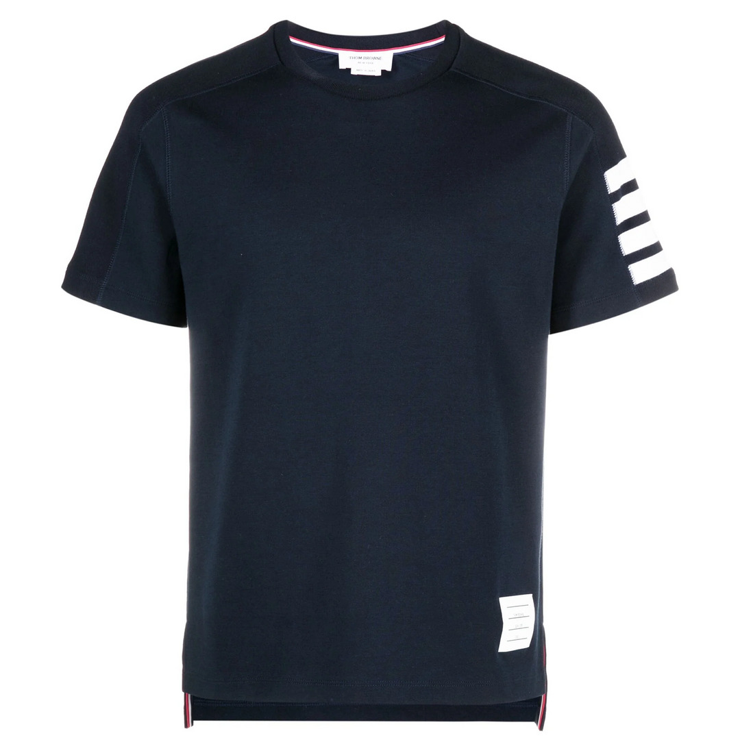 Thom Browne Short Sleeve Tee With 4 Bar Stripe - 100% Cotton - Navy - Crew neck - Short sleeves - Signature 4-Bar stripe - Name tag applique - Signature grosgrain loop tab - Short side slits - High-low hem - Hem hits at hips - Relaxed fit