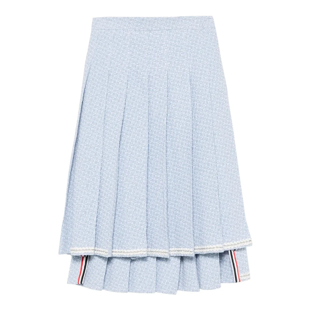 600068861LBL038 / PF25-FGC400B-F0959/00/480 - Premium tweed construction - Knife-sharp pleated panels - Signature tricolor grosgrain ribbon trim - High-waisted fit - Knee-length silhouette - Layered pleated hem detail - Side zip closure The Thom Browne Solid Tweed Pleated Skirt delivers sophisticated preppy elegance with architectural construction and signature brand details. Crafted from premium light blue tweed with knife-sharp pleats and the iconic tricolor grosgrain ribbon trim. The structured silhouette and classic schoolgirl-inspired design create a refined statement piece for contemporary wardrobes.