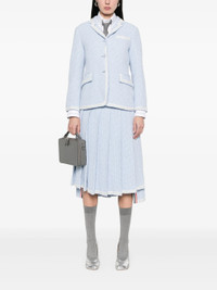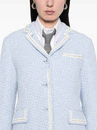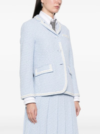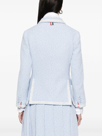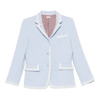 600068859LBL038 / PF25-FBC700B-F0959/00/480 - Light blue tweed construction - White contrast trim detailing - Signature tricolor striped interior lining - Notched lapels with contrast piping - Two front flap pockets - Single chest pocket - Three-button front closure - Structured shoulders - Tailored fit Thom Browne Solid Tweed Sportcoat delivers refined tailoring with signature preppy sophistication and structured feminine silhouette. Crafted from premium light blue tweed with contrasting white trim detailing and signature red, white, and blue striped interior lining. The classic blazer construction and meticulous finishing showcase the brand's heritage in American luxury tailoring.