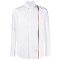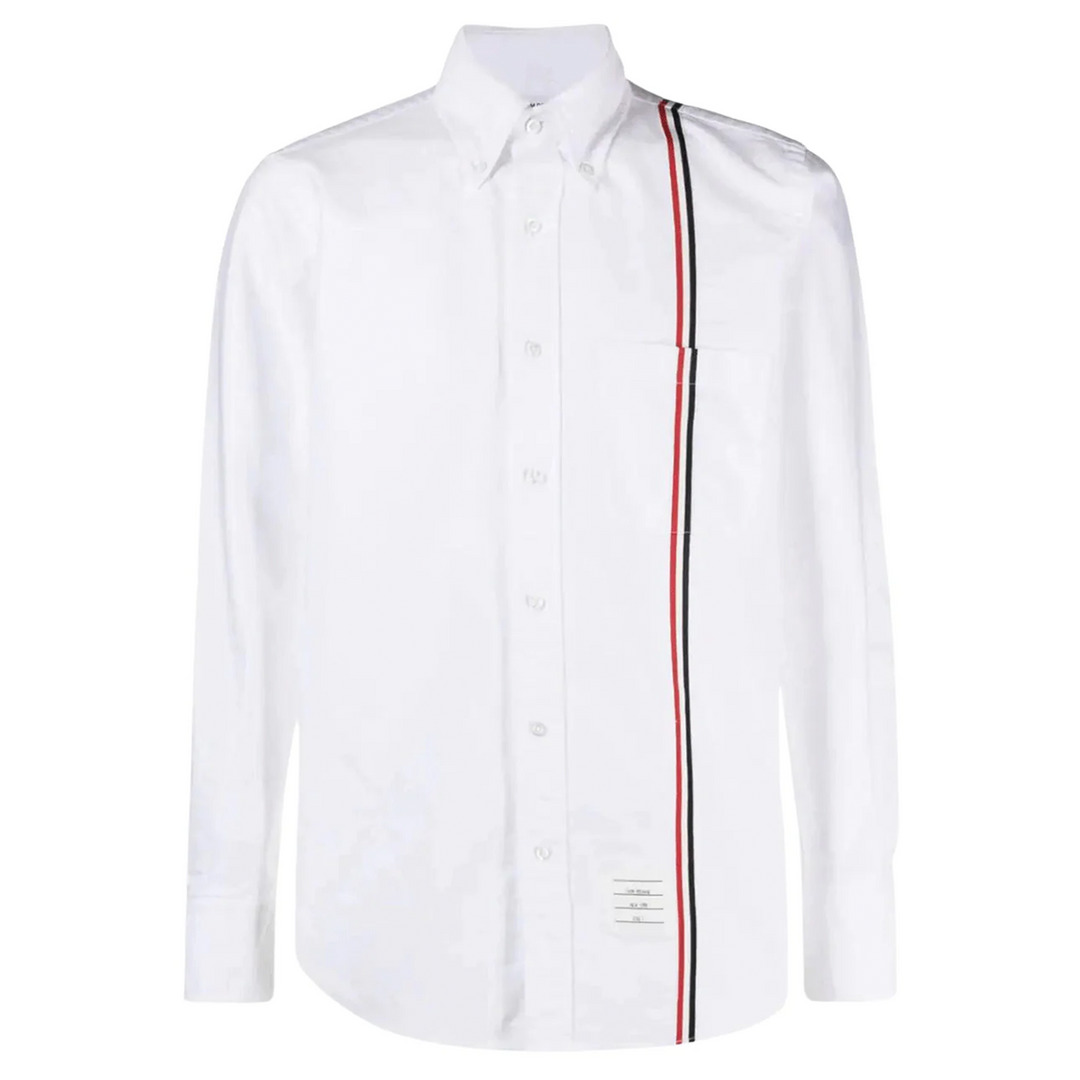 Thom Browne Straight Fit Button Down Shirt - 100% Cotton - White - Button-down collar - Long sleeves - Front button fastening - Grosgrain ribbon trim - Chest patch pocket - Name tag applique - Buttoned cuffs - Signature grosgrain loop tab - Curved hem - Hem hits at hips - Straight fit