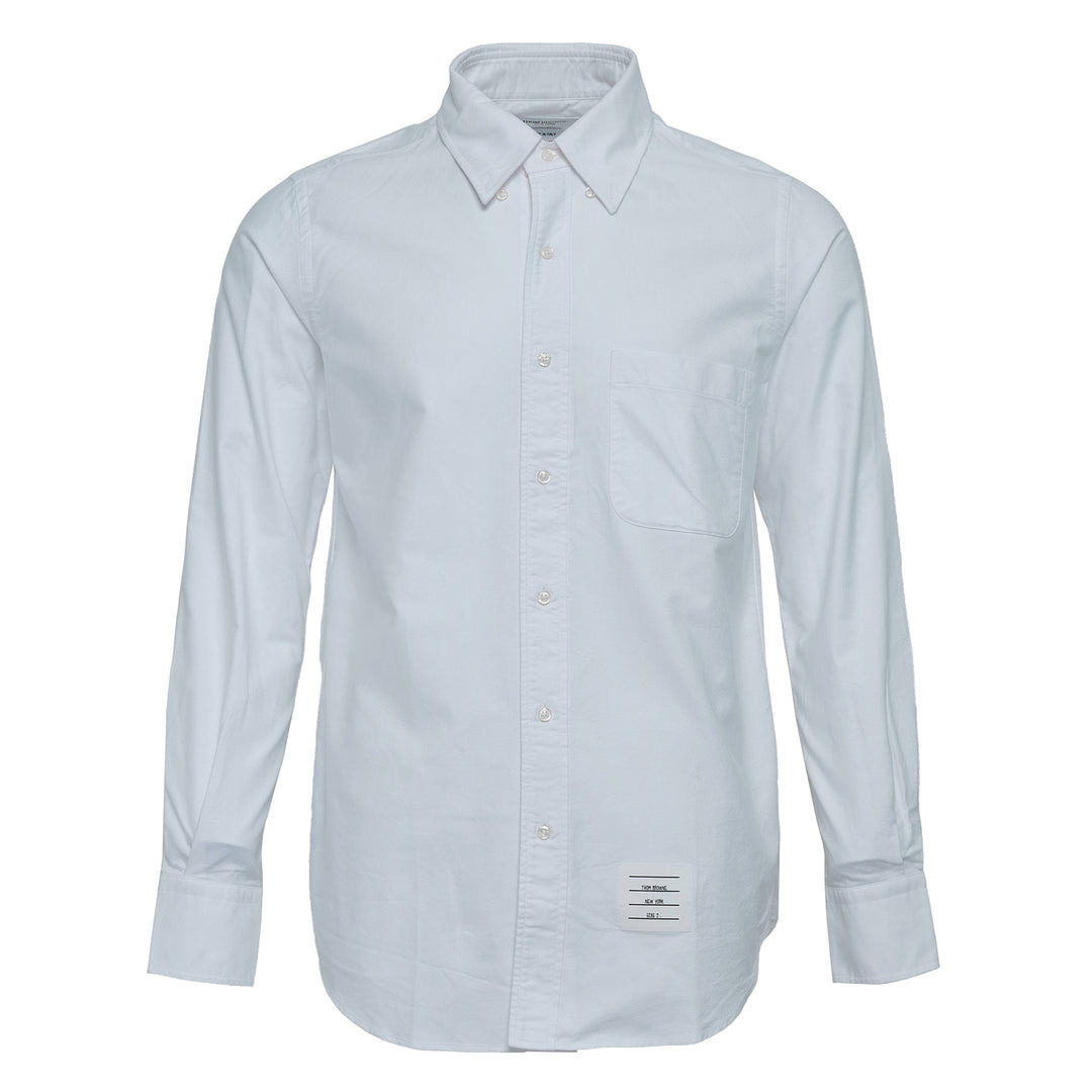 Thom Browne Straight Fit Button Down Shirt The Straight Fit Button Down Shirt showcases Thom Browne's minimalist design ethos, enhanced by the center back RWB stripe and a discreet logo patch on the front. This piece embodies simplicity and signature branding, making it the standout addition to your formal wardrobe. - 100% Cotton - White - Classic collar - Long sleeves - Centre back stripe - Signature grosgrain tab - Logo patch - Buttoned cuffs - Curved hem - Hem hits below hips - Straight fit
