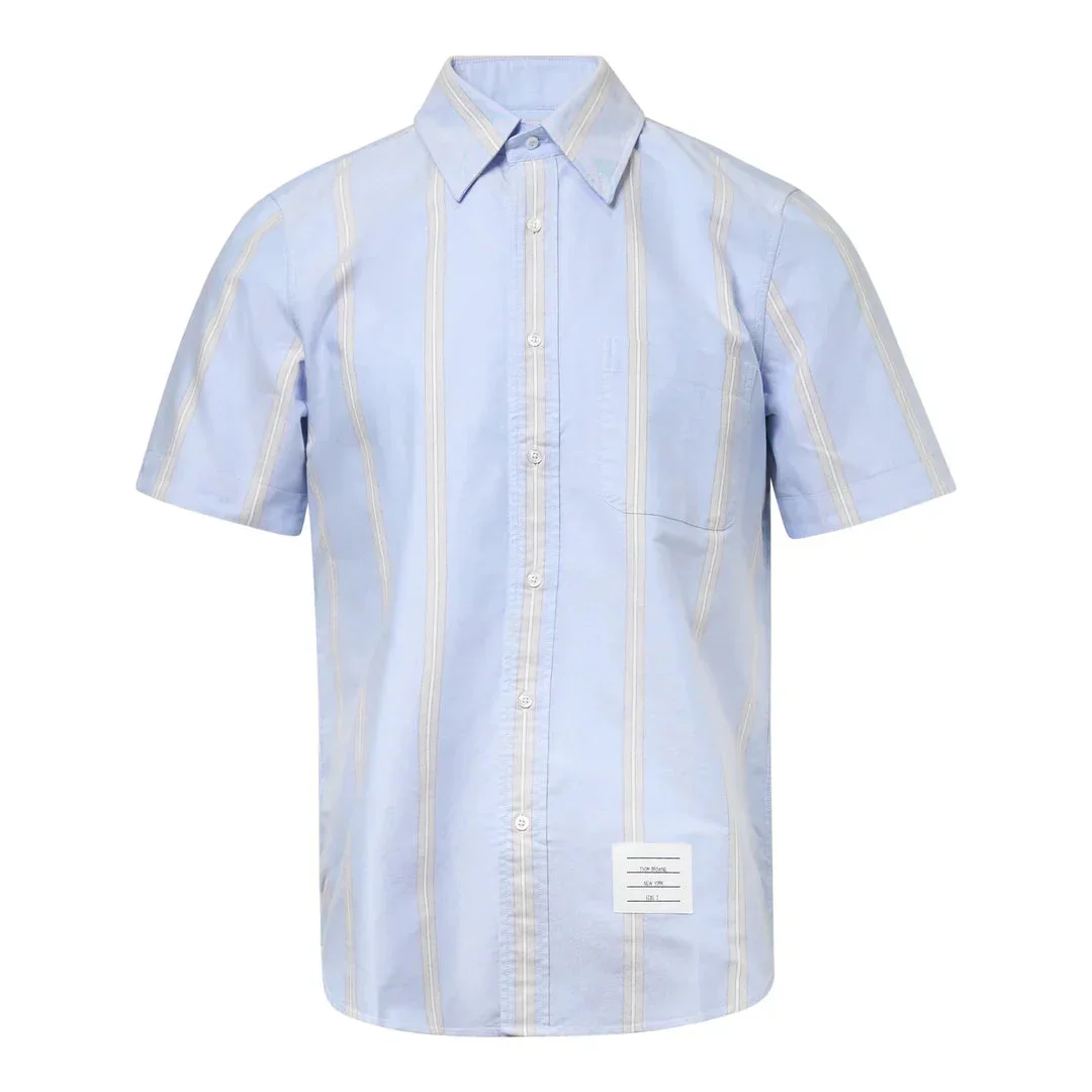 300051377LBL-00 / E6MWS239A-F0662/00/480 - Classic point collar - Short sleeves - Full button front closure - Single chest pocket - Vertical pinstripe pattern - Straight fit silhouette - Cotton poplin construction - Signature Thom Browne label detail The Thom Browne Straight Fit Button Down Short Sleeve Shirt delivers classic American tailoring with contemporary refinement. Crafted from premium cotton poplin in light blue with vertical white pinstripes, featuring the brand's signature precise construction and attention to detail. The straight-fit silhouette and classic collar design create a versatile foundation piece for modern professional wardrobes.