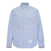 600068931LBL001 / AW25-MWL426A-F0313/00/480 - Shawl collar design - Button-front closure with white buttons - Single chest pocket with button detail - Long sleeves with tricolor grosgrain cuff trim - Straight fit silhouette - Premium cotton construction - Signature Thom Browne label detail The Thom Browne Straight Fit Shawl Collar Long Sleeve Shirt delivers contemporary sophistication with refined tailoring and distinctive design details. Crafted from premium light blue cotton with a soft brushed finish, featuring the brand's signature tricolor grosgrain trim at the cuffs. The relaxed shawl collar and straight-cut silhouette create a modern take on classic American menswear.