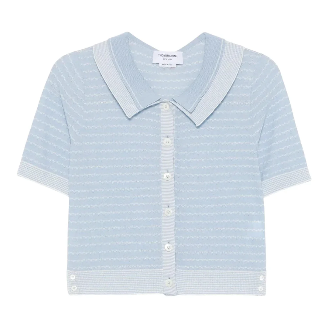 600068835LBL038 / PF25-FKC654A-Y3502/00/480 - Button-front closure with signature buttons - Classic spread collar - Short sleeves with ribbed trim - Tuck stitch construction throughout - Contrasting striped detailing - Regular fit - Premium cotton blend fabric Thom Browne Striped Tuck Stitch Short Sleeve Cardigan delivers refined American luxury with signature preppy sophistication. Crafted from premium cotton blend in light blue with contrasting white striped details, featuring the brand's iconic tailored construction. The structured tuck stitch technique and classic button-front closure create a timeless piece that embodies Thom Browne's scholarly aesthetic.