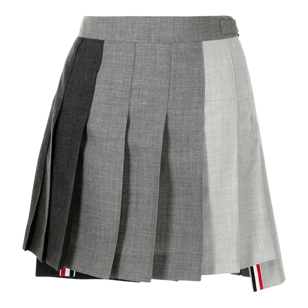 600059955CHA036 / FGC789F-00473/00/025 - High-waisted structured waistband - Sharp knife pleat construction - Dropped back hemline design - Grey colorblocked panels - Signature tricolor grosgrain tape trim - Premium wool blend suiting fabric - Thigh-length front hem - Side zip closure Thom Browne Thigh Length Dropped Back Pleated Skirt delivers contemporary femininity with signature structured tailoring and asymmetrical design elements. Crafted from premium wool blend suiting fabric in sophisticated grey colorblocking, featuring sharp knife pleats and extended back hemline. The signature tricolor grosgrain tape detailing and structured waistband exemplify Browne's refined American craftsmanship.