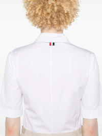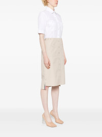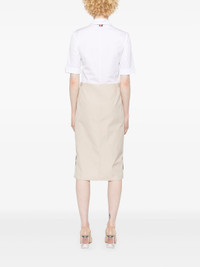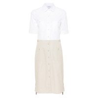 600060107BGE038 / SS25-FDSF05U-04502/00/250 - Color-blocked white and beige construction - Button-through front closure - Functional patch pockets - Classic point collar - Long sleeves with button cuffs - Premium cotton shirting fabric - Structured tailored fit - Thigh-length silhouette The Thom Browne Thigh Length Patch Pocket Dress delivers sophisticated American tailoring with distinctive preppy refinement. Crafted from premium white cotton shirting with contrasting beige lower section, featuring the brand's signature button-through construction and structured silhouette. The color-blocked design and functional patch pockets create a modern interpretation of classic American sportswear.
