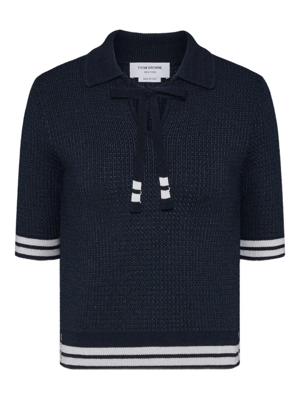 600068974NVY040 / AW25-FKP128B-Y4007/00/415 - Silk, cashmere and wool blend construction - Tuck stitch knit technique - Classic polo collar with button placket - Short sleeves with striped cuff detail - Signature white stripe trim - Ribbed hem with contrast stripes - Regular fit Thom Browne Tuck Stitch Silk Cashmere Wool Polo delivers sophisticated luxury with refined athletic elegance. Crafted from a premium blend of silk, cashmere, and wool in navy with signature white stripe detailing, featuring the brand's signature tuck stitch construction. The classic polo silhouette with ribbed collar and hem showcases Thom Browne's mastery of elevated sportswear.