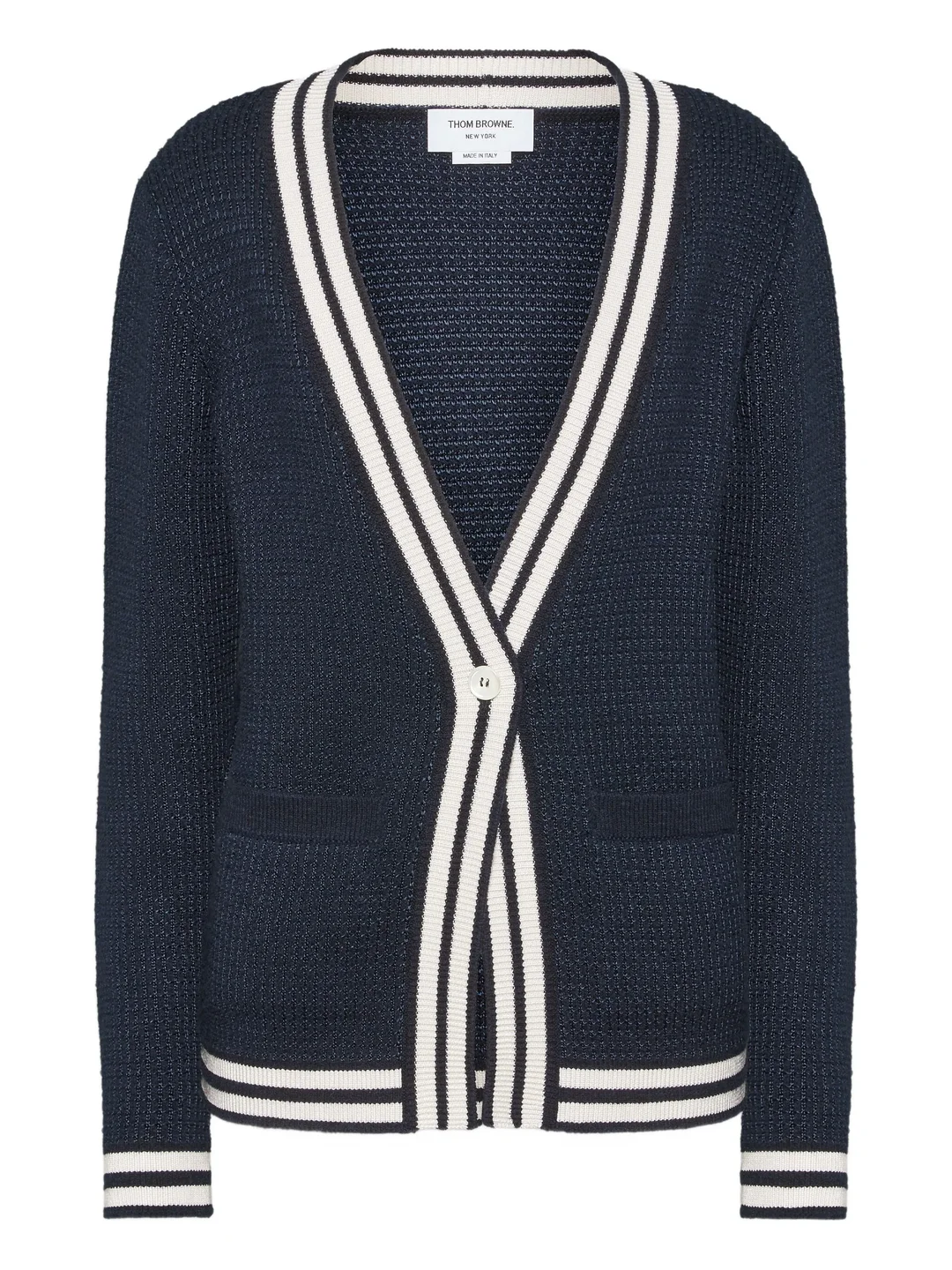 Thom Browne Tuck Stitch Silk Cashmere & Wool V Neck Cardigan Women