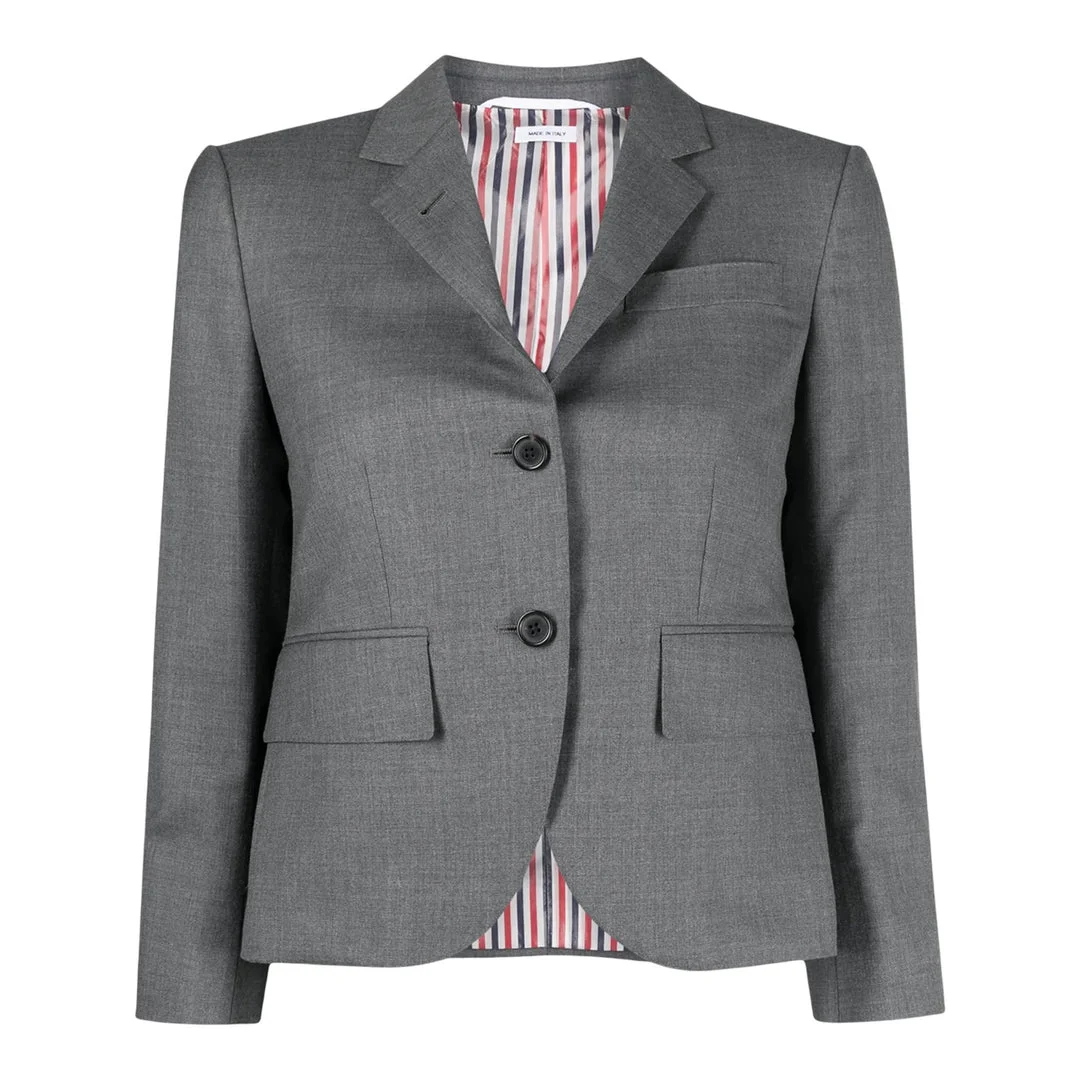 300047644GRY-42 / C5UNI-FBC010V-00626/00/035 - Two-button front closure - High armhole construction - Notched lapels - Patch pockets at front - Signature striped lining - Premium wool twill construction - Tailored fit The Thom Browne Twill High Armhole Sport Coat delivers structured sophistication with the brand's signature tailored precision for women. Crafted from premium wool twill in charcoal grey, featuring high-positioned armholes for a refined silhouette and enhanced mobility. The classic two-button closure and signature striped lining showcase Thom Browne's distinctive American luxury aesthetic.
