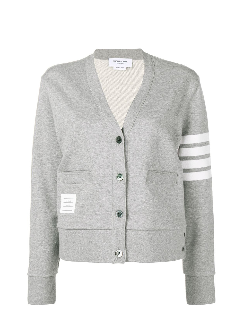 Thom Browne V Neck Cardigan Subtle tones? Coming right up. Go for a sporty style in this 4-Bar stripe cardigan from Thom Browne. This cardigan features a logo patch to the front in a muted colorway, making it a versatile piece that can be dressed up or down. - 100% Cotton - Light Grey - V-neck - Long sleeves - Signature 4-Bar stripe - Front button fastening - Logo patch to the front - 2 Front Pockets - 2 Side Openings - Signature grosgrain loop tab