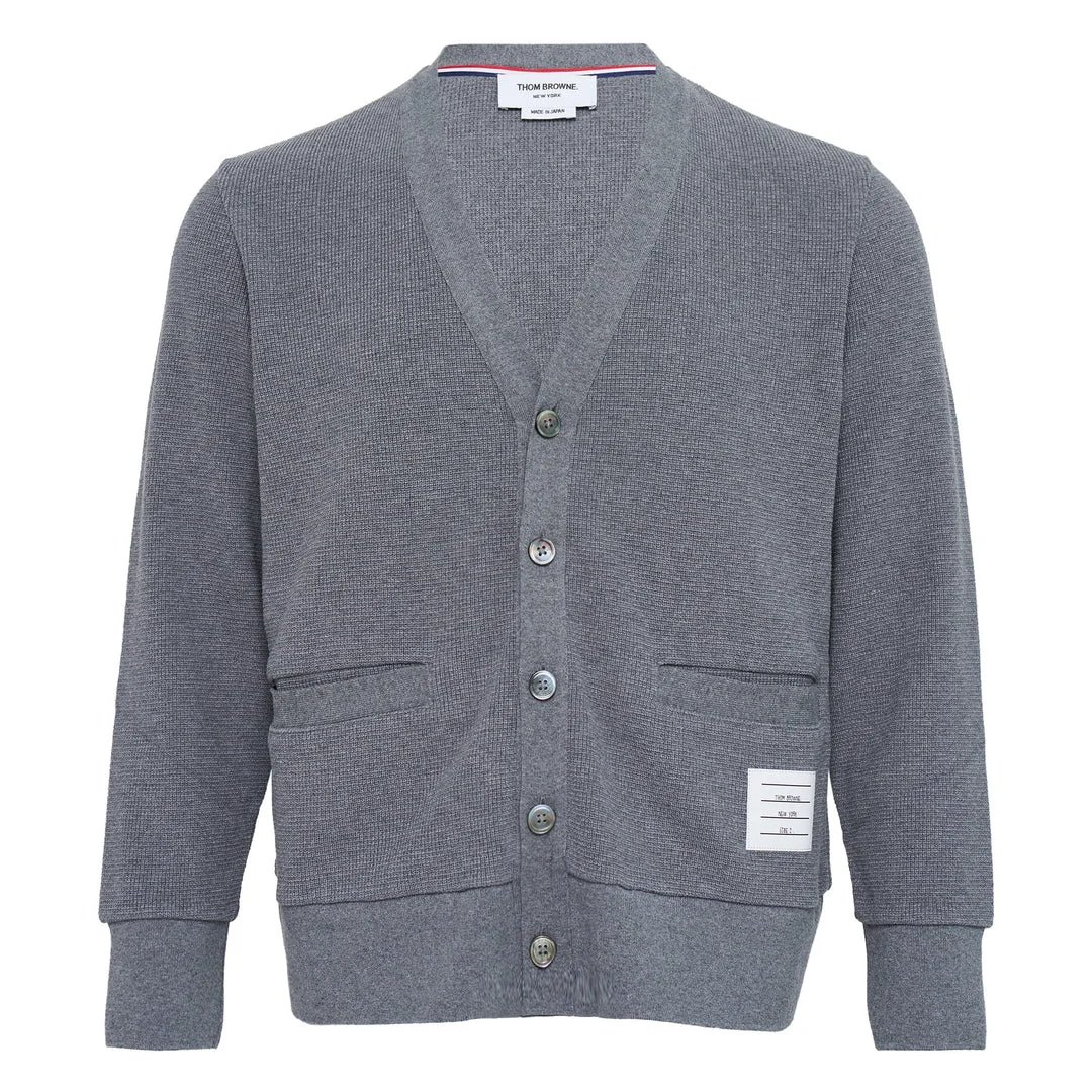 The Thom Browne V Neck Cardigan delivers preppy luxury with the designer's signature 4-bar intarsia detailing. Crafted from premium fine-gauge merino wool in sophisticated light gray, featuring classic button-front closure and ribbed trims. The iconic tricolor 4-bar stripes at the collar create an unmistakable Thom Browne statement piece.