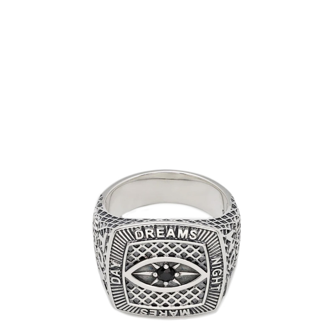 600032263SLV-54 / R75COBSP01S925-B/00/SILVER - 925 sterling silver construction - Central black gemstone eye design - Engraved "DREAMS" text on face - Diamond-pattern textured sides - Championship ring inspired silhouette - Substantial weight and presence - Vintage-style oxidized finish The Tom Wood Champion Ring Black Eye Sterling delivers bold statement jewelry with championship-inspired design and premium craftsmanship. Crafted from solid 925 sterling silver with intricate engraved detailing and a central black gemstone eye motif. The substantial weight and vintage-inspired aesthetic create a distinctive piece that embodies the brand's Scandinavian luxury heritage.