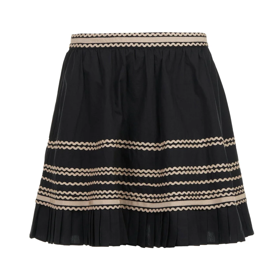 300051081BLK-00 / E6PS260329/00/NOIR - Elasticated waistband for comfortable fit - Tiered construction with ruffled hem - Contrasting zigzag trim detail - Lightweight cotton fabric - Mini length silhouette - Relaxed fit through hips The Ulla Johnson Adaleigh Mini Skirt delivers bohemian sophistication with feminine tiered construction and artisanal detailing. Crafted from lightweight cotton in classic black, featuring intricate zigzag trim and a flounced hem that creates beautiful movement. The elasticated waistband and relaxed silhouette embody the brand's signature romantic aesthetic with contemporary wearability.