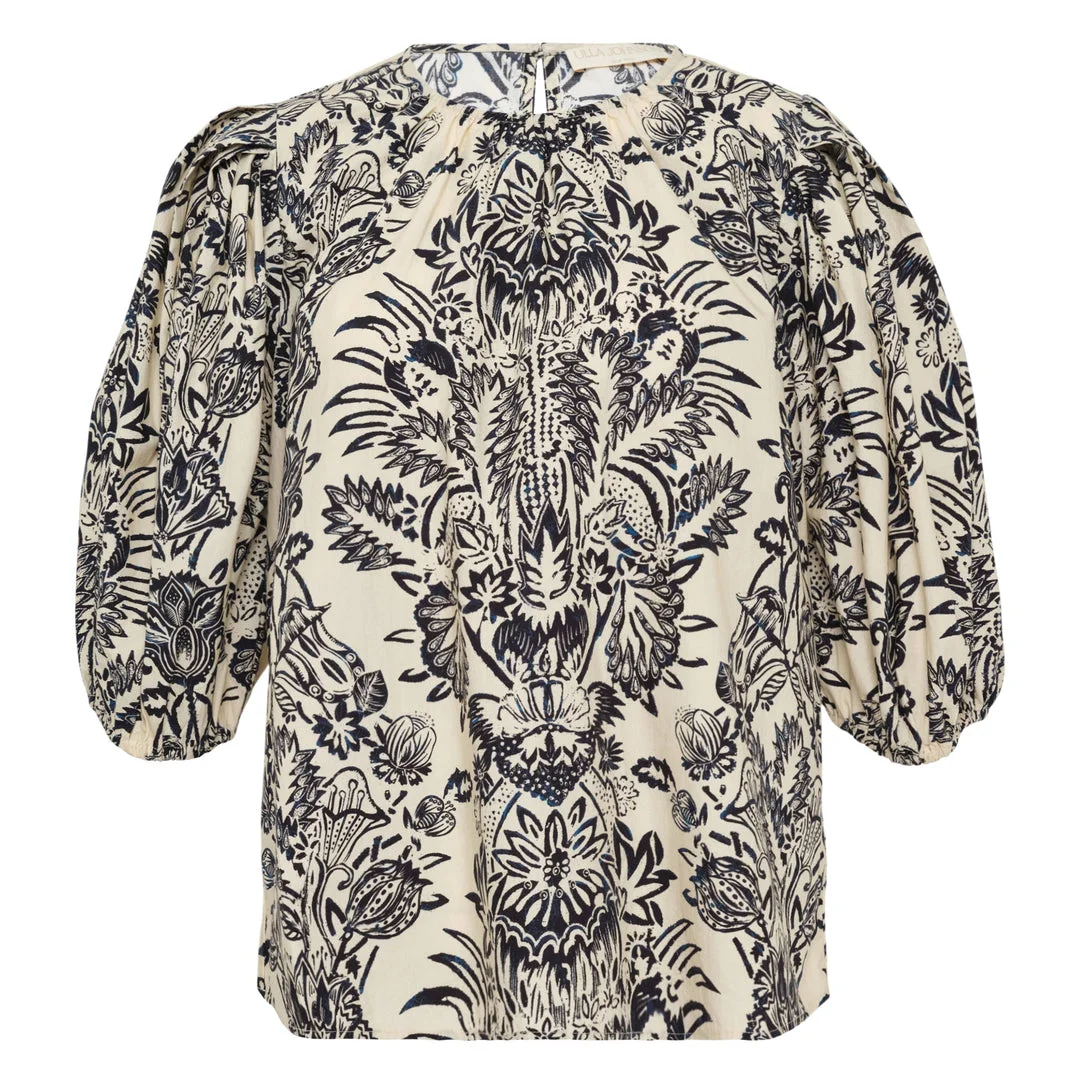 600078629OWT--0 / PS260230/00/IVFL - Botanical floral print throughout - Dramatic puff sleeves with gathered cuffs - Round neckline - Back button closure - Lightweight woven construction - Relaxed fit silhouette - Three-quarter sleeve length The Ulla Johnson Frantiska Puff Sleeve Top delivers bohemian elegance with vintage-inspired botanical prints and feminine silhouettes. Crafted from flowing lightweight fabric featuring intricate floral motifs in cream and navy, designed with voluminous puff sleeves and a relaxed fit. The signature Ulla Johnson aesthetic combines artisanal prints with romantic details for effortless sophisticated styling.