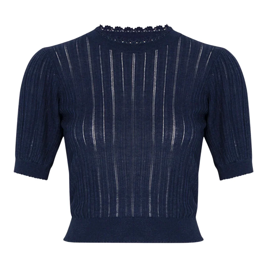 300048291NVY-SS / P5PF250736/00/MID - High mock neckline with scalloped lace trim - Short sleeves with fitted cut - Semi-sheer vertical ribbed knit construction - Cropped length silhouette - Soft stretch knit fabric - Form-fitting design The Ulla Johnson Gemma Short Sleeve Knit Top delivers feminine sophistication with intricate craftsmanship and vintage-inspired details. Crafted from soft ribbed knit fabric in deep navy, featuring delicate lace trim at the neckline and semi-sheer vertical striping throughout. The fitted silhouette and high mock neckline create an elegant foundation piece with the brand's signature romantic aesthetic.