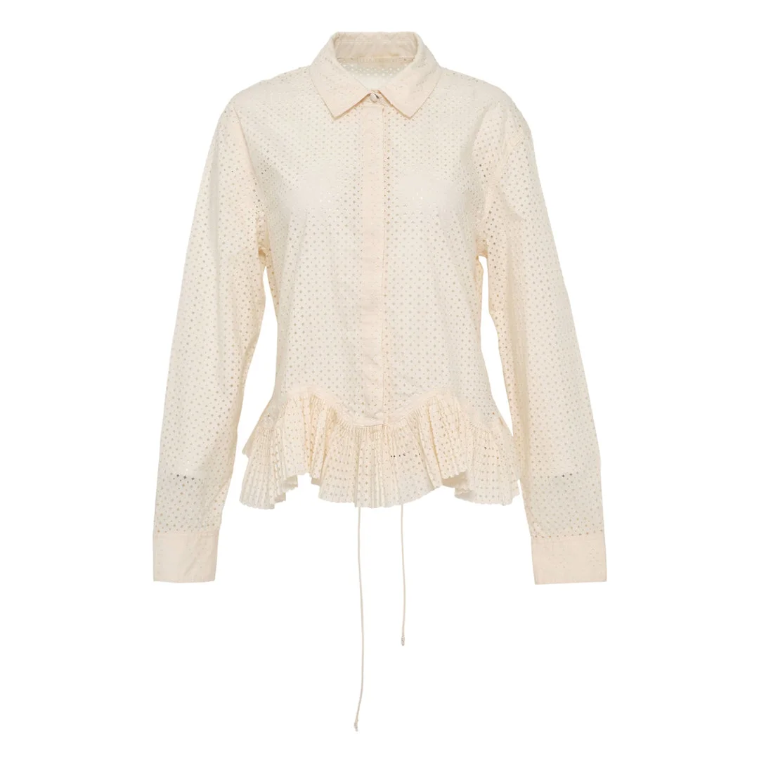 600078630WHT002 / PS260240/00/CWRIE - Classic point collar - Full button front closure - Long sleeves with fitted cuffs - Eyelet cotton construction with perforated pattern - Ruffled peplum hem detail - Regular fit through body - Self-fabric belt included The Ulla Johnson Kelila Long Sleeve Button Up Blouse delivers romantic femininity with vintage-inspired craftsmanship. Crafted from delicate eyelet cotton in soft ivory, featuring intricate perforated patterns throughout and a dramatic ruffled peplum hem. The classic shirt silhouette and artisanal detailing create an elevated bohemian statement for contemporary styling.