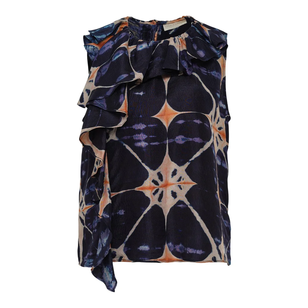 600070435DBL006 / PF250248/00/ORN - Sleeveless design with dramatic ruffles - Abstract floral print in navy, coral and purple - Lightweight silk construction - Asymmetrical ruffle detailing - Round neckline - Relaxed fit The Ulla Johnson Nya Sleeveless Top delivers feminine sophistication with bohemian elegance and refined craftsmanship. Crafted from lightweight printed silk featuring dramatic ruffled detailing and an abstract floral pattern in navy, coral and purple tones. The asymmetrical ruffle placement and flowing silhouette create a signature romantic aesthetic perfect for elevated casual styling.