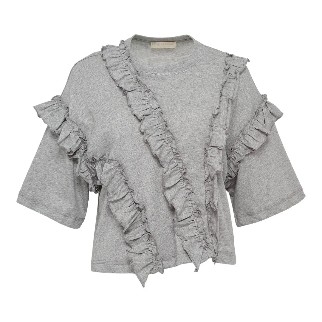 600070447GRY00P / PF250806/00/SLTME - Cascading ruffle trim details - Round neckline - Short sleeves with ruffle accents - Soft cotton jersey construction - Relaxed fit - Pull-over design The Ulla Johnson Sydney Short Sleeve Ruffle Tee delivers romantic femininity with contemporary comfort and playful detailing. Crafted from soft cotton jersey in classic heather gray, featuring cascading ruffle trim that creates dynamic movement and visual interest. The relaxed fit and intricate ruffle construction showcase the brand's signature bohemian-meets-modern aesthetic.