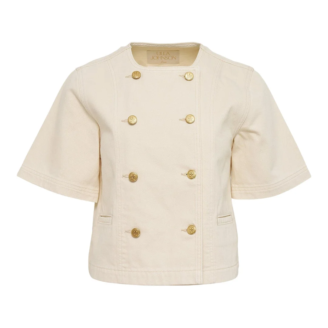600070455OWT00L / UJ9905027/00/BIR - Double-breasted closure with gold-tone buttons - Short sleeves with structured shoulders - Front patch pockets - Round neckline - Premium cotton blend construction - Tailored fit - Contrast topstitching details Ulla Johnson Serge Short Sleeve Jacket delivers timeless sophistication with contemporary tailoring and feminine elegance. Crafted from premium cotton blend in sophisticated cream, featuring structured construction with polished gold-tone buttons throughout. The double-breasted silhouette and refined detailing create an elevated wardrobe staple perfect for transitional seasons.