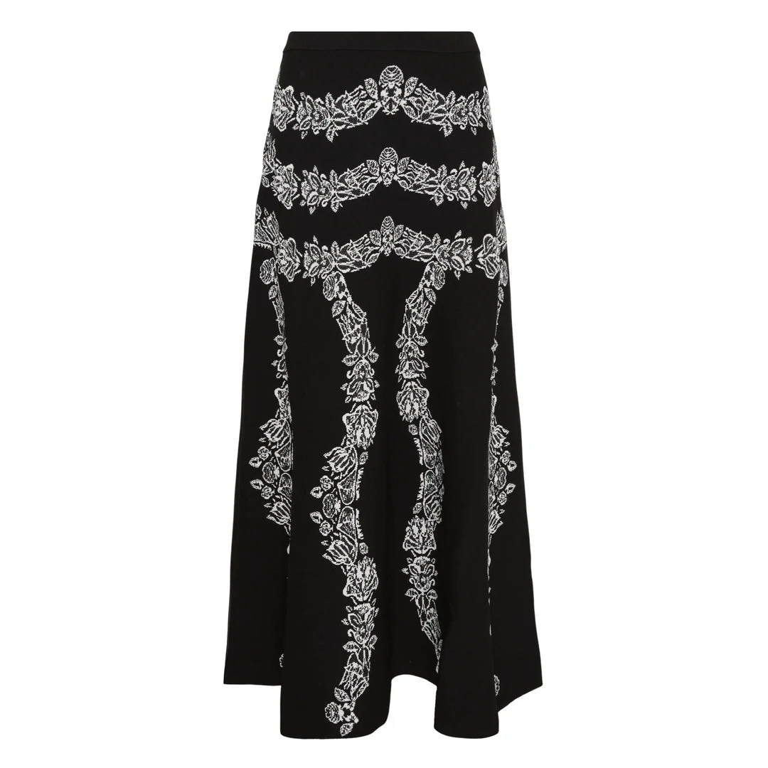 600078642BLK00M / PS260741/00/NOI - High-waisted design with fitted bodice - White floral jacquard embroidery throughout - A-line silhouette with midi length - Side zip closure - Fully lined interior - Flared hem with subtle godet inserts Ulla Johnson Valencia Jacquard Midi Skirt delivers bohemian elegance with intricate embroidered detailing and flattering silhouette. Crafted from premium cotton with white floral jacquard embroidery cascading across the black base, featuring a fitted waist and flowing A-line shape. The signature romantic aesthetic and artisanal embroidery work create a statement piece perfect for elevated occasions.