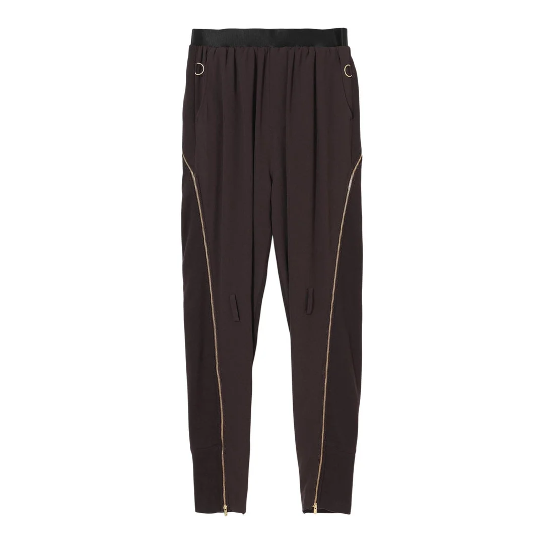 600072997BRN001 / UP2E1502/00/DARK BROWN - Elastic waistband with contrast trim - Full-length zippers along leg seams - Metal D-ring hardware at waist - Tapered leg construction - Technical fabric blend - Slim fit silhouette UNDERCOVER Pants With Zipper Trim deliver avant-garde Japanese streetwear with architectural detailing and modern functionality. Crafted from premium technical fabric in deep brown, featuring contrast elastic waistband and signature metal zipper accents along the legs. The streamlined silhouette and industrial hardware create a bold statement piece for contemporary wardrobes.
