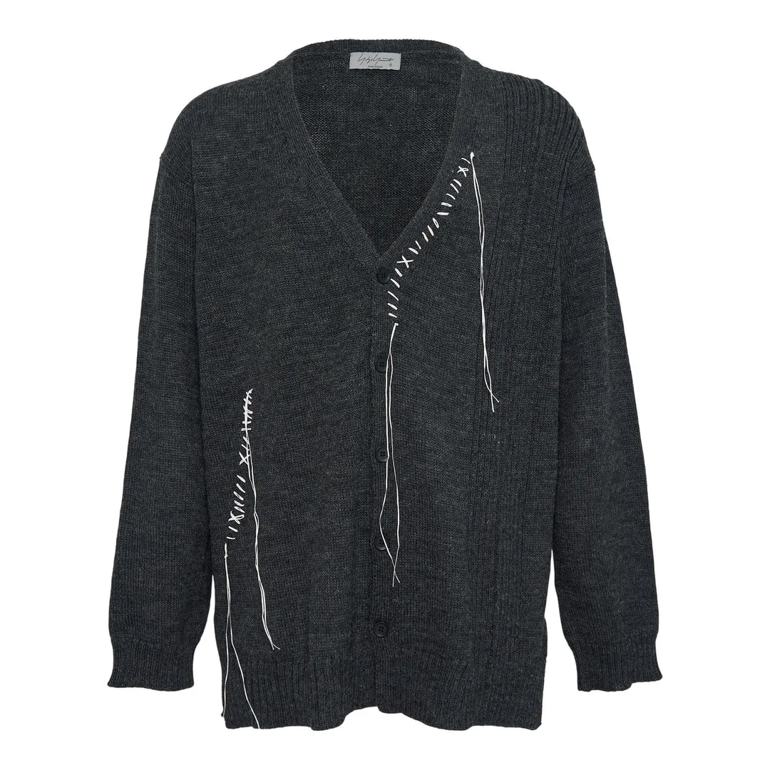 600070302CHA003 / HL-K88-196/00/1 - V-neck design with button-front closure - Contrasting white embroidery throughout - Hand-stitched linear detailing - Long sleeves with ribbed cuffs - Premium knit construction - Relaxed oversized fit The Yohji Yamamoto Embroidery V Neck Cardigan delivers avant-garde elegance with distinctive hand-stitched detailing. Crafted from premium charcoal knit fabric, featuring contrasting white embroidered stitching that creates artistic linear patterns across the garment. The deconstructed aesthetic and signature Yohji Yamamoto tailoring philosophy create a contemporary statement piece.