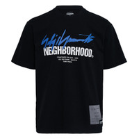 600077364BLK003 / HK-T97-997/00/2 - Premium cotton construction - Oversized graphic print on front - Paris collection seasonal branding - Crew neck design - Short sleeves - Relaxed fit - Signature label patch at hem Yohji Yamamoto's Neighborhood Short Sleeve Tee delivers streetwear luxury with Japanese craftsmanship and bold graphic design. Constructed from premium cotton in classic black, featuring oversized blue script branding and Paris collection details. The relaxed fit and signature Neighborhood aesthetic create an authentic statement piece for contemporary streetwear enthusiasts.