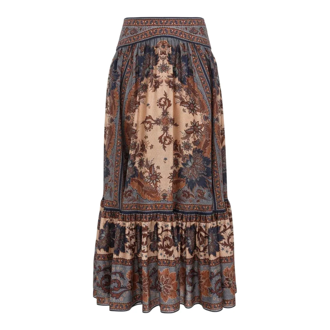 600070172BLU000 / 3479SSS253/00/BLCMINFLO - Elasticated high waistband - Three-tiered construction with ruffle hem - Ornate paisley print with border design - Midi length silhouette - Flowing A-line cut - Side seam construction The ZIMMERMANN Ascension Tiered Midi Skirt delivers bohemian elegance with intricate paisley print design and flowing silhouette. Crafted from lightweight silk-feel fabric featuring ornate paisley patterns in rich browns, blues, and cream tones with decorative border details. The tiered construction and gathered waistband create feminine movement while maintaining the brand's signature romantic aesthetic.
