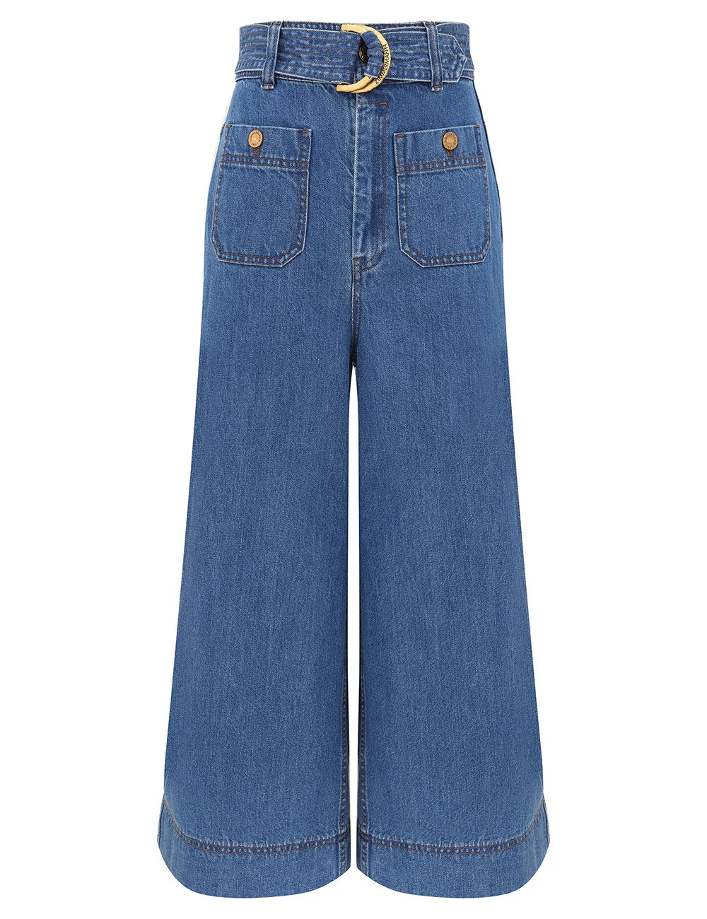 300052103BLU-24 / S67507PS26R/00/Bay Blue - High-waisted design with wide belt loops - Wide-leg culotte silhouette - Front patch pockets with button details - Gold-tone metal hardware - Cropped ankle length - Premium denim construction The ZIMMERMANN Denim Culotte delivers contemporary elegance with wide-leg sophistication and vintage-inspired details. Crafted from premium blue denim with high-waist construction, featuring functional front pockets and gold-tone button hardware. The structured wide-leg silhouette and cropped length create a modern statement piece that bridges casual and refined styling.