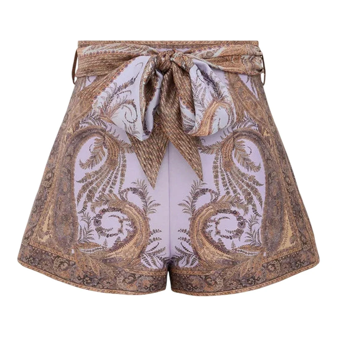 600074219LIL000 / 5214AF251/00/LPSL - High-waisted design - Tie-front waistband closure - Flat front construction - Golden paisley print on lilac base - Lightweight premium fabric - Relaxed fit through hips - Mini short length ZIMMERMANN Hypnotic Flat Front Short delivers bohemian luxury with sophisticated tailoring and feminine silhouette. Crafted from premium lightweight fabric in lilac with intricate golden paisley print throughout, featuring a high-waisted design with elegant tie-front closure. The signature ZIMMERMANN aesthetic combines romantic prints with contemporary cuts for effortless summer styling.
