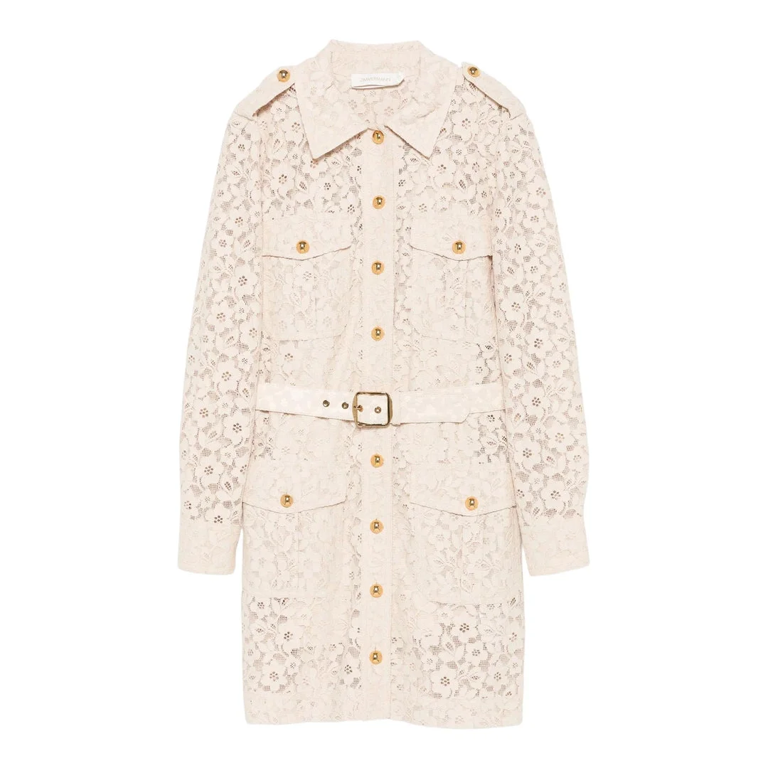 300049129BGE-P0 / A55248DF251/00/CRM - All-over floral lace construction - Button-front closure with gold-tone buttons - Utility-style chest and waist pockets - Belted waist with buckle closure - Epaulettes at shoulders - Long sleeves with button cuffs - Mini dress length - Fully lined Zimmermann Hypnotic Lace Utility Dress delivers romantic femininity with contemporary utility styling. Crafted from delicate ivory lace with all-over floral motifs, featuring structured utility-inspired details and gold-tone hardware accents. The sophisticated lace construction and military-inspired silhouette create an elevated statement piece for special occasions.