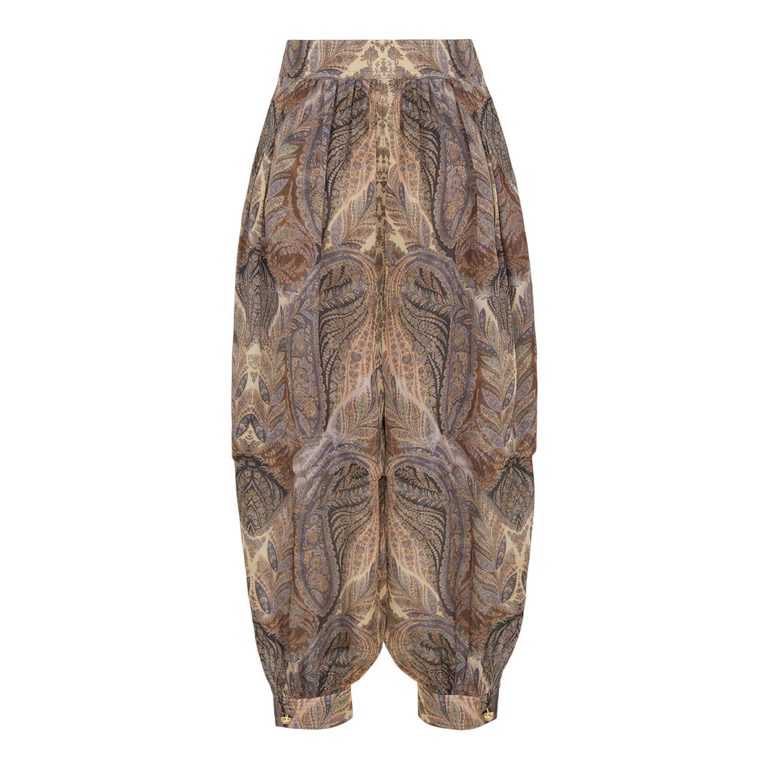 600074212MLT001 / 4843PF251/00/DENP - Premium silk construction - Intricate paisley print - High-waisted with elasticated waistband - Relaxed harem-style fit - Tapered legs with gathered cuffs - Side seam pockets - Fully lined ZIMMERMANN Hypnotic Silk Harem Pant delivers bohemian luxury with fluid draping and sophisticated silhouette. Crafted from premium silk featuring an intricate paisley print in earthy tones of brown, taupe, and gold with relaxed harem-style construction. The gathered waistband and tapered legs create an effortlessly elegant statement piece for elevated casual styling.