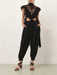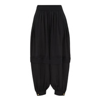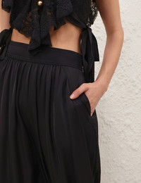 600074212BLK000 / 4843PF251/00/BLK - Elasticated high waistband - Gathered ankle cuffs with button closure - Side seam pockets - Relaxed harem silhouette - Premium silk construction - Comfortable loose fit ZIMMERMANN Hypnotic Silk Harem Pant delivers bohemian elegance with luxurious draping and contemporary silhouette. Crafted from premium silk in sophisticated black, featuring an elasticated waistband and gathered ankle cuffs for comfort and style. The relaxed harem design and signature ZIMMERMANN feminine aesthetic create an effortlessly chic statement piece.